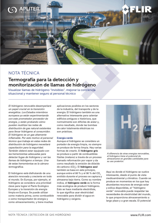 Descargue este artículo técnico donde se analizan técnicas de detección y monitorización de hidrógeno a través de cámaras termográficas, así como los retos de seguridad asociados a su distribución y uso, y las ventajas que ofrece el hidrógeno como fuente de energía limpia.