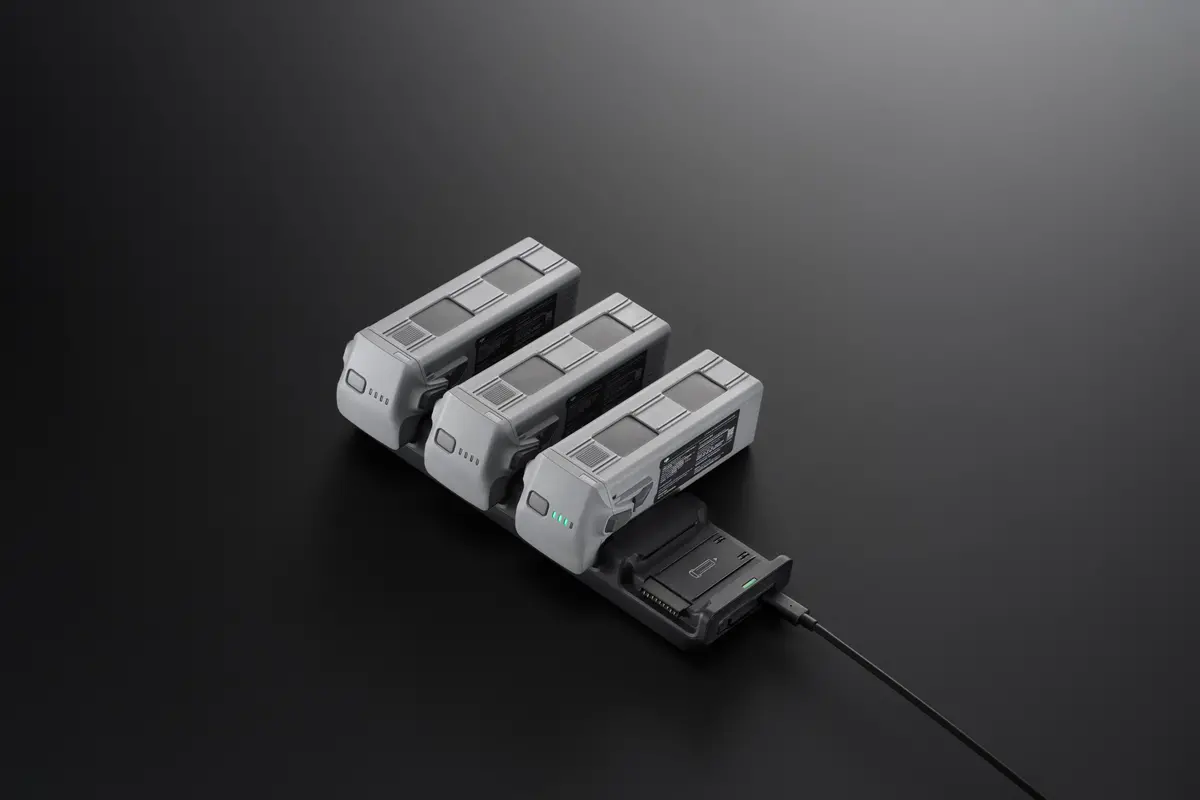 - Es necesario el adaptador de corriente USB-C DJI 100 W cuando se utiliza el centro de carga para cargar baterías de vuelo inteligentes.