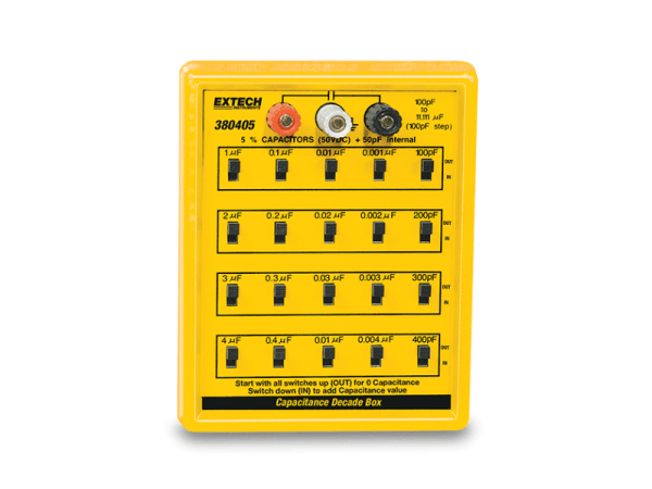 La caja de capacitancia a décadas Extech 380405 es muy popular para las pruebas y la calibración de diseño de productos porque se puede sustituir fácilmente por un circuito y una función en lugar de cualquier componente con un valor estándar. Alternativamente, se puede utilizar para identificar el mejor valor para el funcionamiento del circuito y luego leer ese valor de los interruptores. Luego, se puede colocar en el circuito un capacitor del tamaño indicado por los interruptores de caja de resistencia a décadas.