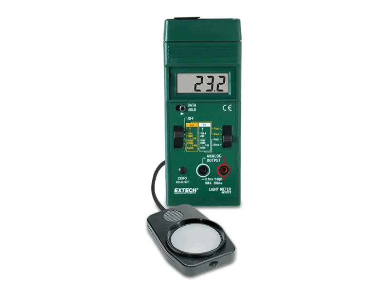 El Extech 401025 es un medidor de pies candela/lux que mide el nivel de luz hasta 5000 FC (pies candela) y 50 000 lux con una precisión del 5 % utilizando un fotodiodo de precisión y un filtro de corrección de color. El medidor presenta un tiempo de respuesta rápido/lento y una salida analógica (1 mV por recuento) para capturar lecturas en un registrador. Viene Incluye batería de 9 voltios.