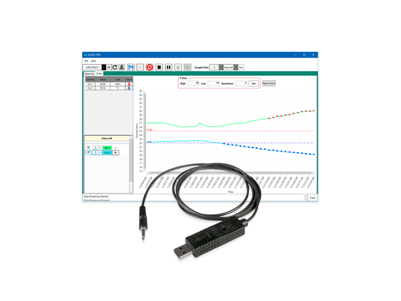 Convierta medidores específicos de Extech en un registrador de datos. El software Extech 407001-PRO permite al usuario transmitir datos en vivo desde medidores compatibles a un PC o portátil mientras almacena los datos recopilados para su uso posterior en la generación de un gráfico o informe. Los datos se pueden ver como una lista o en un gráfico y se pueden guardar como un archivo con formato CSV o TXT y exportar a un bloc de notas o Excel®. Para los productos que tienen múltiples canales, el usuario puede codificar con color cada canal. También tiene alarmas altas/bajas programables por el usuario que mostrarán puntos rojos (arriba) o azules (abajo) cuando las lecturas excedan los puntos establecidos en el gráfico.