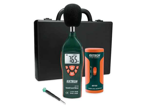 El Extech 407732-KIT medidor de nivel de sonido tipo 2 cumple con las normas ANSI e IEC 651 tipo 2. Ideal para estudios de ruido en el lugar de trabajo, instalación de alarmas contra incendios y sistemas de altavoces y cumplimiento de ordenanzas sobre ruido. Mide de 35 a 130 dB en 2 rangos y tiene una precisión de ±1,5 dB. Funciones de retención de datos y retención de máximos. La pantalla retroiluminada permite su uso en áreas poco iluminadas. Incluye maletín de transporte de plástico para medidor y calibrador.