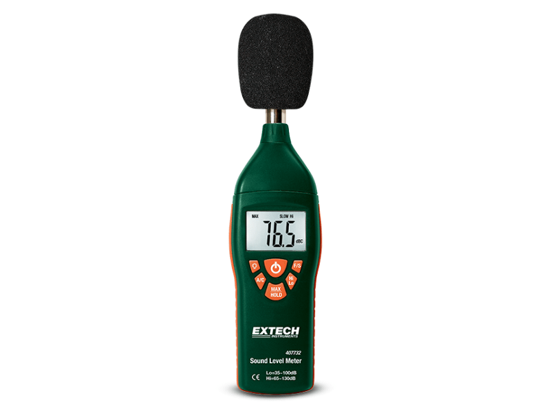 El medidor de nivel de sonido Extech 407732 tipo 2 cumple con las normas ANSI e IEC 651 tipo 2. Idóneo para estudios de ruido en el lugar de trabajo, instalación de alarmas contra incendios y sistemas de altavoces y cumplimiento de normativas sobre ruido. Mide de 35 a 130 dB en 2 rangos con una precisión de más o menos 1,5 dB. Funciones de retención de datos y retención de máximos. La pantalla retroiluminada permite su uso en áreas poco iluminadas. Incluye protector para viento de micrófono y pila de 9 V.