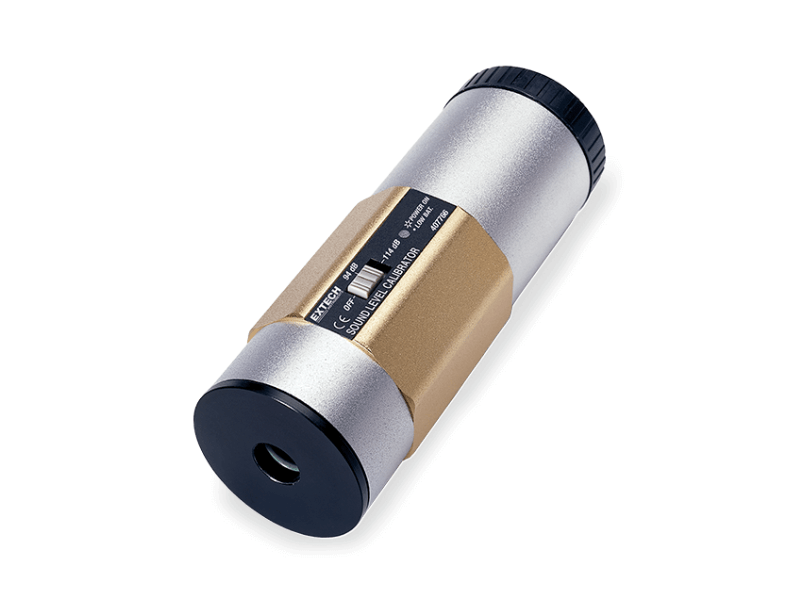 El calibrador de sonido profesional de 1 kHz 94/114 dB Extech 407766 es para micrófonos de 0,5 pulg. o 1 pulg. Calibra y verifica el funcionamiento del medidor de nivel de sonido. Interruptor de posición de nivel para seleccionar 94 dB o 114 dB con luz indicadora LED de encendido. La resistente carcasa de aluminio fundido a presión genera una onda sinusoidal de 1 kHz a 94 dB/114 dB con una precisión del 5 % (frecuencia) y ±0,5 dB (94 dB)/±1,0 dB (114 dB). Cumple con la norma IEC 60942 1997-11. Incluye dos pilas de 9 V, estuche de transporte y destornillador.