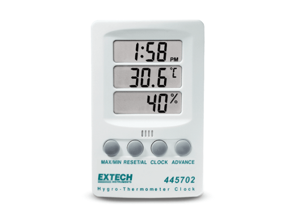 El Extech 445702 combina 3 pantallas de tiempo, temperatura y humedad. El reloj muestra tanto el horario de 12 como el de 24 horas. Incluye un máximo/mínimo con función de restablecimiento. La humedad mide del 10 % de HR al 85 % de HR ± 6 % HR, y medidas de temperatura -10°C a 60°C ± 1°C (de 14°F a 140°F ± 1,8°F). Incluye soporte de inclinación integrado, abrazadera para montaje en pared y 1 pila AAA.