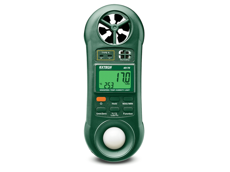 El medidor Extech 45170 4 en 1 mide la humedad, la temperatura, la velocidad del aire y la luz. La pantalla LCD dual muestra simultáneamente la temperatura y la velocidad del aire o la humedad relativa. Se pueden realizar mediciones de aire o superficies a alta temperatura utilizando la entrada tipo K incorporada. Viene completo con sensor de humedad incorporado, sensor de luz y rueda de paletas, correa para la muñeca y batería de 9 voltios.