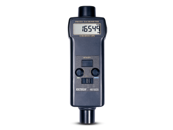 Realice mediciones de RPM con tacómetro, velocidad estroboscópica y análisis de movimiento con el fototacómetro y estroboscopio combinados 461825 de Extech. La pantalla única invierte la dirección de los caracteres según el modo de medición que esté utilizando. La memoria del tacómetro almacena las lecturas última, máxima y mínima para recuperarlas. La luz estroboscópica cuenta con ajustes de frecuencia de flash finos y de curso en 3 rangos. Se completa con 4 pilas AA, cinta reflectante y estuche de transporte.
