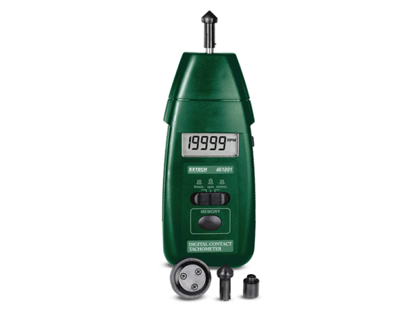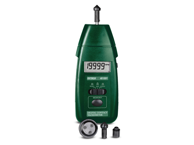 El Extech 461891 es un tacómetro de contacto. Las ruedas de superficie miden las velocidades de la superficie de contacto (de 10 a 9999 rpm) de los objetos giratorios. El botón de memoria retiene la última lectura y recupera lecturas máx./mín. Incluye ruedas para medir la velocidad superficial lineal (de 0,05 a 1999,9 metros/minuto; de 0,2 a 6560 pies/minuto) o las RPM. Incluye punta cónica, punta plana y rueda de repuesto para mediciones de velocidad superficial, cuatro pilas AA, estuche de transporte y manual de usuario.