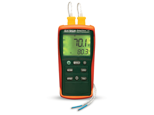 El termómetro de entrada doble EA10 EasyView™ de Extech es un termómetro tipo K básico con un amplio rango de temperatura. Tiene un rango de temperatura de -200°C a 1360°C (de -200°°F a 1999°°F) con una resolución de 1°°C/ 0,1°°F. Cuenta con retención de datos, apagado automático, batería baja e indicación de sobrerrango. Incluye un pie integrado, funda protectora, dos sondas de temperatura de alambre de talón tipo K y pilas.