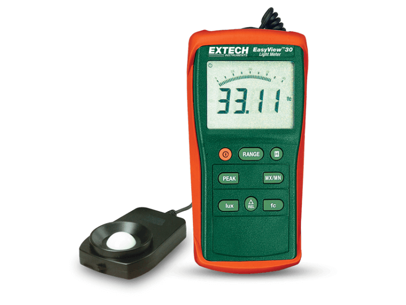 El fotómetro Extech EA30 tiene un diseño compacto y resistente y cuenta con una pantalla grande. Amplios rangos de medición múltiples: 40 000 Fc en 4 rangos y 400 000 Lux en 5. La retención de datos congela la lectura en las lecturas Mín./Máx. de la pantalla. Función cero coseno y medidas corregidas por color. Indicación de batería baja y sobrerrango. Apagado automático para alargar la duración de la pila. El medidor utiliza un sensor de fotodiodo de silicio de precisión con un cable en espiral de 3 pies para un fácil almacenamiento. Incluye soporte integrado, sensor remoto con tapa protectora, funda protectora de goma y 6 pilas AAA.