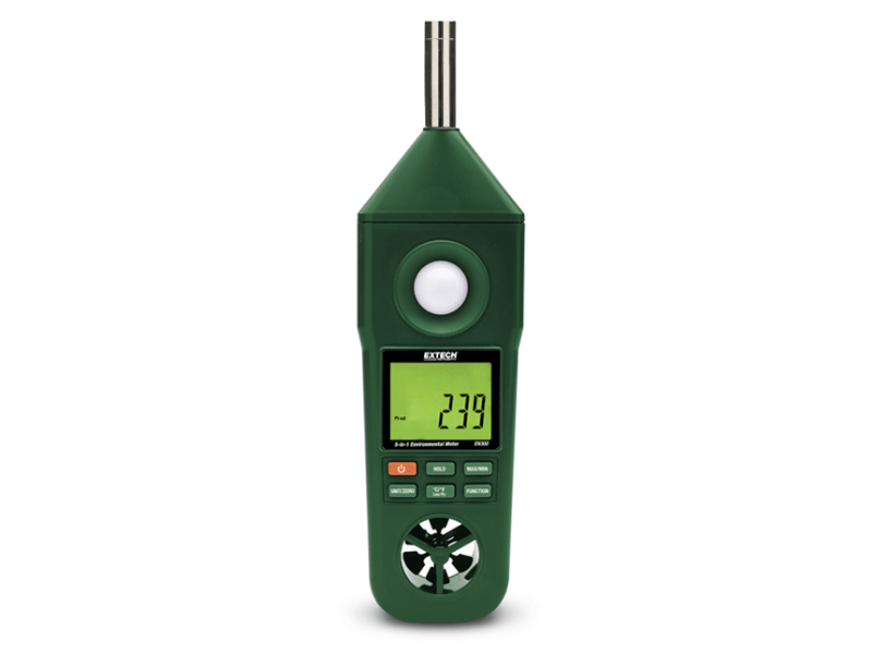 El Extech EN300 mide humedad relativa, temperatura, velocidad del aire, luz y sonido. Medidor ambiental 5 en 1 resistente con soporte para trípode e interfaz de PC RS-232. Gran pantalla LCD doble simultánea de temperatura y velocidad del aire o humedad relativa. Los caracteres en la pantalla invierten la dirección dependiendo del modo Higro-Termo-Anemómetro o Luz-Sonido. Retención de datos, mín./máx., apagado automático, indicación de batería baja/fuera de rango. Las aspas de baja fricción incorporadas mejoran la precisión de la velocidad del aire en pies/min, MPH, m/s, km/h y nudos. Sensor de humedad de capacitancia de película fina de precisión incorporado para agilizar la respuesta. Termistor incorporado para mediciones de temperatura ambiente. La entrada tipo K mide la temperatura hasta 2372° (1300°C). Utiliza un fotodiodo de precisión y un filtro de corrección para mediciones de luz corregidas por color y coseno. La medición del nivel de sonido cumple con IEC 61672 clase 2 utilizando una ponderación de frecuencia A y un tiempo de respuesta rápido. Incluye sonda de termopar tipo K, estuche tipo bolsa y seis pilas AAA de 1,5 V.