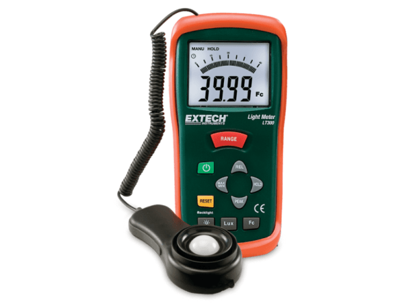 Una iluminación insuficiente puede crear riesgos de seguridad o infringir medidas de la OSHA. El medidor de luz Extech LT300 puede determinar si dispone de la iluminación adecuada para proteger a trabajadores, estudiantes, visitantes, pacientes o asistentes a diferentes lugares. Este instrumento portátil mide hasta 40 000 Fc (o 400 000 lux) utilizando un sensor de luz remoto conectado a través de un cable en espiral de 30 cm extensible hasta 60 cm (12 a 24 pulgadas). Una lectura LCD altamente visible muestra un cálculo digital y un gráfico de barras analógico complementario para realizar evaluaciones rápidas y fiables. Incluye batería de 9 V, sensor de luz con tapa protectora, funda protectora y estuche blando de transporte.
