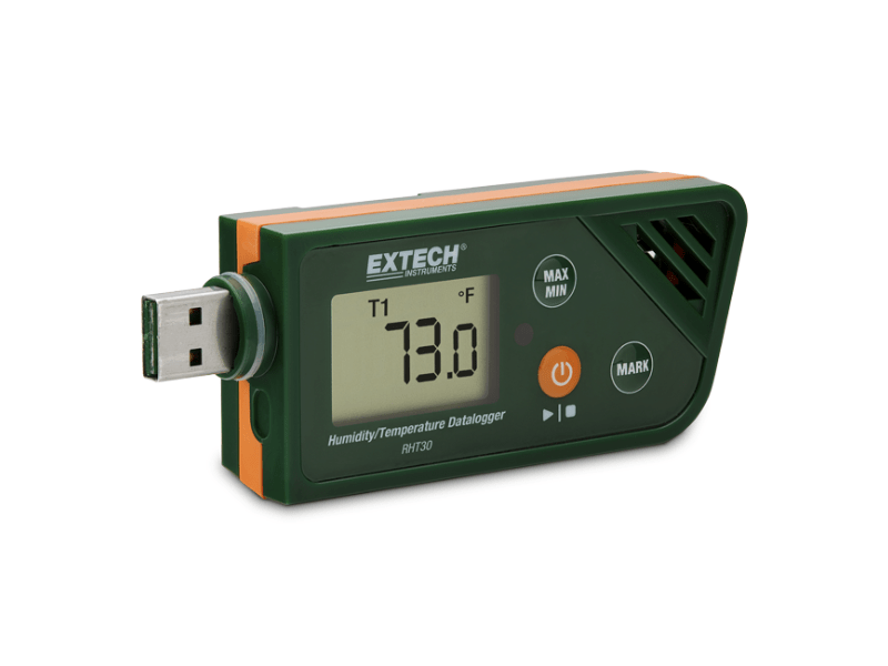 El registrador de datos Extech RHT30 está diseñado con una carcasa resistente y un conector USB estándar, donde las lecturas almacenadas (hasta 48 000 datos) se transfieren cómodamente a un PC en formato de hoja de cálculo PDF o Excel® cuando se conecta. Las características adicionales incluyen un marcador de registro de 8 ubicaciones, 6 opciones de idioma, intervalo de muestreo programable, alarma ajustable e inicio de sesión de seguridad protegido por contraseña. La gran pantalla LCD optimiza la visualización y el LED inteligente proporciona un estado de lectura de temperatura y humedad codificado por colores.