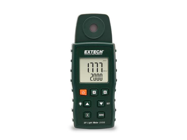 El medidor de luz Extech UV510 mide la radiación de luz UVA procedente de fuentes de luz naturales y artificiales. Cuenta con una pantalla doble retroiluminada, sensor con corrección coseno, dos rangos seleccionables, función de puesta a cero, registro de mínimos/máximos, retención de pantalla y apagado automático. Su tamaño compacto y su práctica correa para la muñeca le permiten realizar lecturas rápidas de los rayos UV cómodamente allá donde vaya.