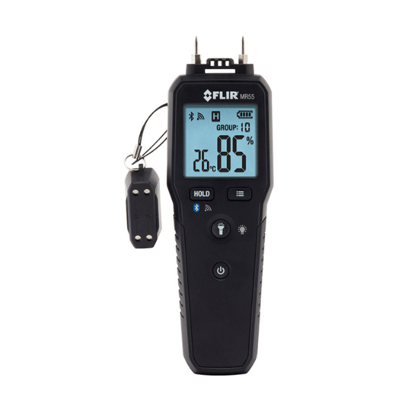 El MR55 es un medidor de humedad con clavija para profesionales que buscan un una herramienta rentable, precisa, resistente y fiable.  Este le permite visualizar el contenido a través de su smartphone o tableta gracias a su opción de conectarse por Bluetooth a la aplicación FLIR Tools.