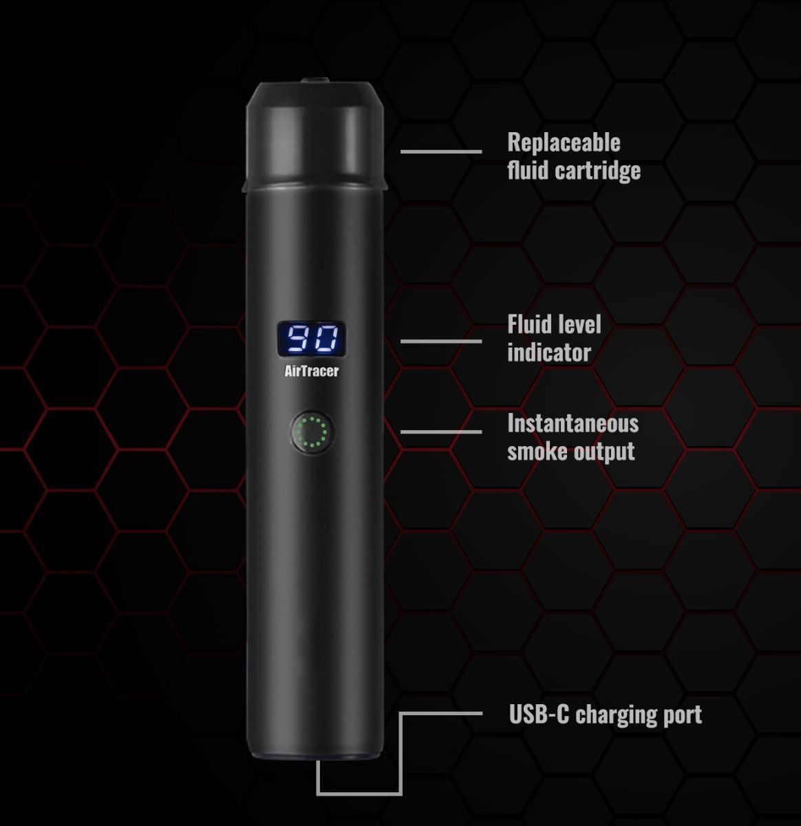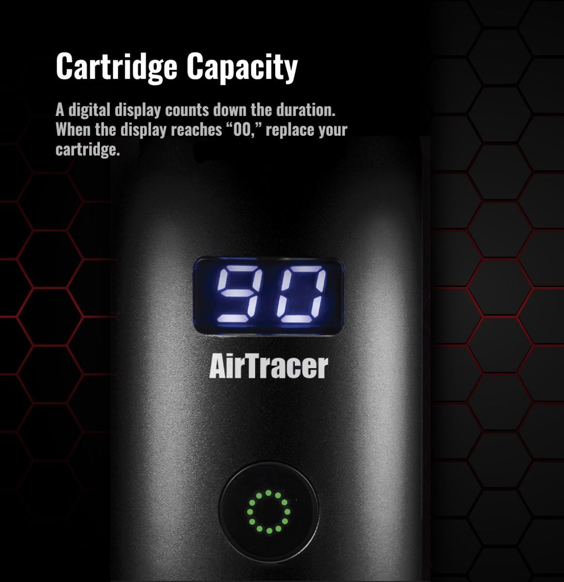 El AirTracer se suministra con dos cartuchos fáciles de sustituir, cada uno de los cuales puede producir hasta 10 minutos de humo. La pantalla digital comienza en «99» y realiza una cuenta atrás a medida que se utiliza el dispositivo, lo que permite saber cuándo es el momento de cambiar el cartucho.
