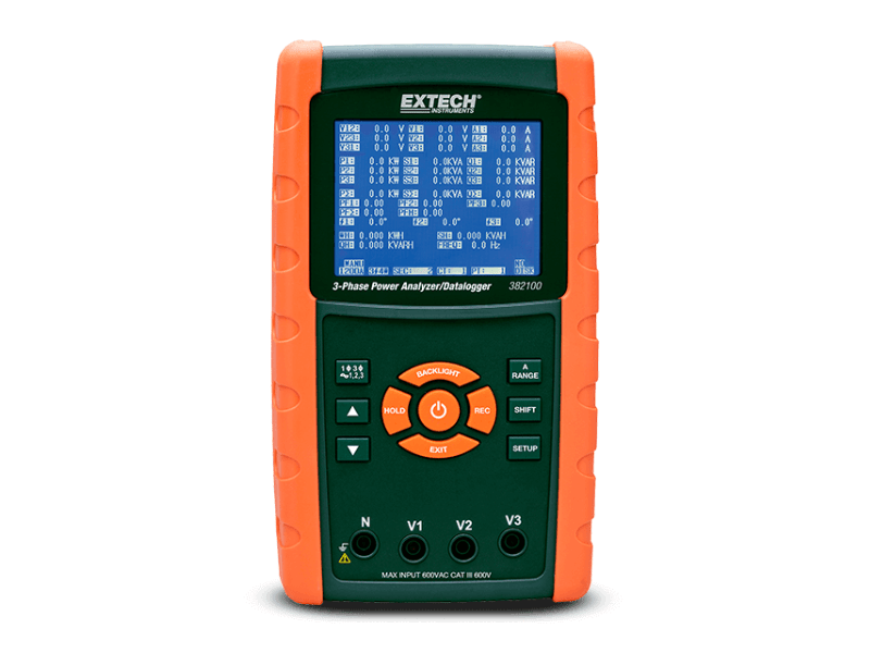 O 382100 da Extech é um analisador de energia/registrador de dados trifásico que armazena dados (até 30.000 conjuntos de medições) em um cartão SD no formato Excel para transferi-los facilmente para o seu PC. Ele fornece uma análise completa do sistema com até 35 parâmetros, incluindo: V (fase a fase), V (fase a terra), A (fase a terra), KW / KVA / KVAR / PF (fase), KW / KVA / KVAR / PF (sistema), KWH / KVAH / KVARH / PFH (sistema) e ângulo de fase. As leituras são apresentadas num grande ecrã LCD retroiluminado, de matriz de pontos, legível à luz. Vem com três pinças amperimétricas, quatro cabos de tensão com pinças crocodilo, oito pilhas AA, cartão de memória SD, adaptador CA universal (de 100 a 240 V), estojo e manual do utilizador.