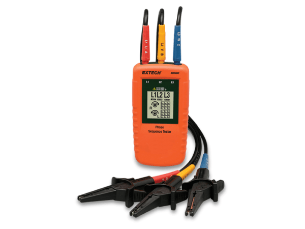 O verificador de sequência de fase Extech 480400 tem uma faixa nominal de 40 a 600 volts para testar a orientação de fase de fontes de alimentação trifásicas em uma faixa de frequência de 15 a 400 Hz. O ecrã LCD gráfico multilinha indica a orientação da fase (no sentido horário ou anti-horário) e se cada uma das fases está ativa. Não requer bateria. Inclui cabo, três pinças crocodilo grandes codificadas por cores e estojo tipo bolsa.