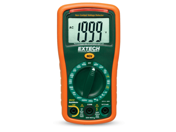 O Extech EX310 é um multímetro manual compacto que possui um ecrã extragrande de 2000 contagens e um detetor de tensão CA sem contacto (NCV) integrado. Medições de tensão e corrente CA/CC, resistência, díodos/continuidade. Inclui uma função de teste de baterias (1,5 volts e 9 volts). A capa de borracha protege o medidor. Certificado UL Cat III – 600 volts de segurança. Inclui cabos de teste, bateria de 9 volts e suporte inclinável.