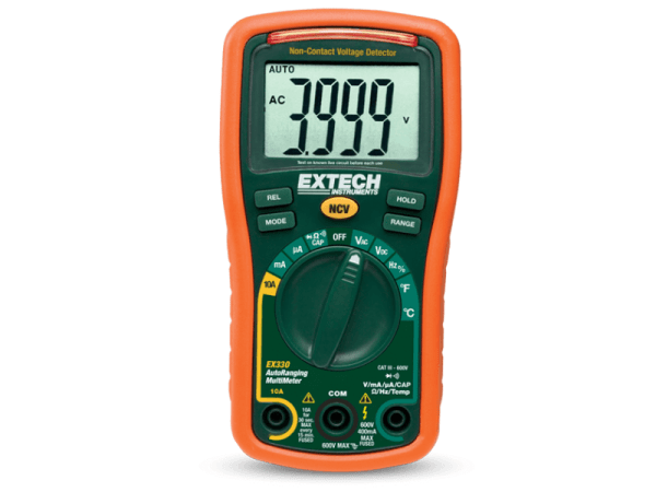 O Extech EX330 é um multímetro compacto de faixa automática que possui um ecrã extragrande de 4000 contagens e um detetor de tensão CA sem contacto. Funções avançadas: frequência, ciclo de trabalho, capacitância e temperatura, teste de diodo e continuidade. Capa de borracha que protege o medidor. Inclui cabos de teste, sonda de temperatura tipo K, duas pilhas AAA e suporte basculante.