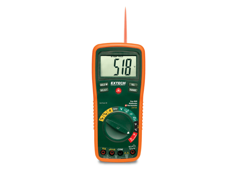 O multímetro e termómetro infravermelho Extech EX470A com medições de capacitância, frequência e ciclo de trabalho e 2 sondas remotas tipo K é o medidor perfeito para a manutenção de sistemas de climatização ou instalações. O termómetro IR mede a temperatura superficial de -20 °C a 270 °C (-4 °F a 518 °F) sem contacto. O ponteiro laser integrado centra a área de medição. As suas funções incluem tensão CA e CC até 600 V, corrente CA e CC até 10 A, resistência até 40 MOhm, continuidade e teste de díodos. Também inclui um termómetro tipo K para medições de temperatura por contacto ou do ar de -20 °C a 750 °C (-4 °F a 1832 °F). O medidor vem completo com cabos de teste, bateria de 9 V, capa protetora, suporte inclinável ajustável e uma alça de velcro para pendurar.