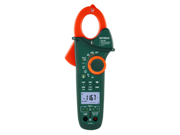 A pinça amperimétrica com RMS real CA/CC Extech EX623A combina entradas duplas de termopar para medições de temperatura diferencial T1, T2 e T1-T2. Possui termómetro infravermelho integrado e um apontador laser para localizar pontos quentes e um detetor de tensão sem contacto (NCV) para verificar se há corrente elétrica ativa de forma segura. Possui uma função de microamperes CC que é ideal para medições de varas de chama em sistemas de climatização, e sua capacidade de medição de capacitância se estende até 40 mF. O EX623A inclui cabos de teste, bateria de 9 V, termopar tipo K, sonda de temperatura de fio de talão e um estojo de transporte.