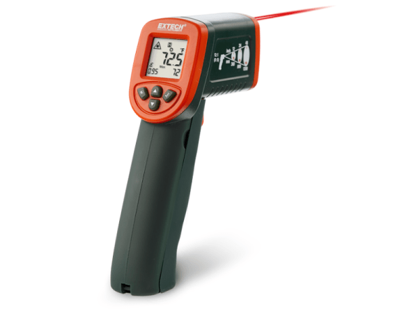 O termómetro infravermelho (IR) compacto sem contacto Extech IR267 mede até 600 °C (1112 °F) com um apontador laser incorporado para identificar a área alvo e melhorar a precisão. A entrada tipo K permite medições de alta temperatura até 1000 °C (1832 °F). O sensor de temperatura incorporado também mede a temperatura do ar. A função de emissividade ajustável permite maior precisão ao medir a temperatura em várias superfícies.