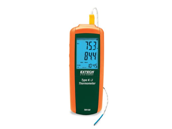 O termómetro de entrada única Extech TM100 tipo J/K tem uma ampla faixa de temperatura de -200 °C a 1372 °C (-328 °F a 2501 °F) para medições do tipo K e de -210 °C a 1100 °C (-346 °F a 2012 °F) para medições do tipo J. Possui alta resolução de 1 °C/0,1 °F, bem como um grande ecrã LCD retroiluminado com leituras em °C, °F ou Kelvin. A função de retenção de dados congela a leitura no ecrã e este mostra o máximo, o mínimo e a média. As leituras capturam uma marca de tempo relativa. Além disso, a tecla de compensação é utilizada para a função zero para realizar medições relativas. Vem com desligamento automático com função de desativação. Este termómetro vem completo com sonda de temperatura de fio tipo K e três (3) pilhas AAA de 1,5 V.